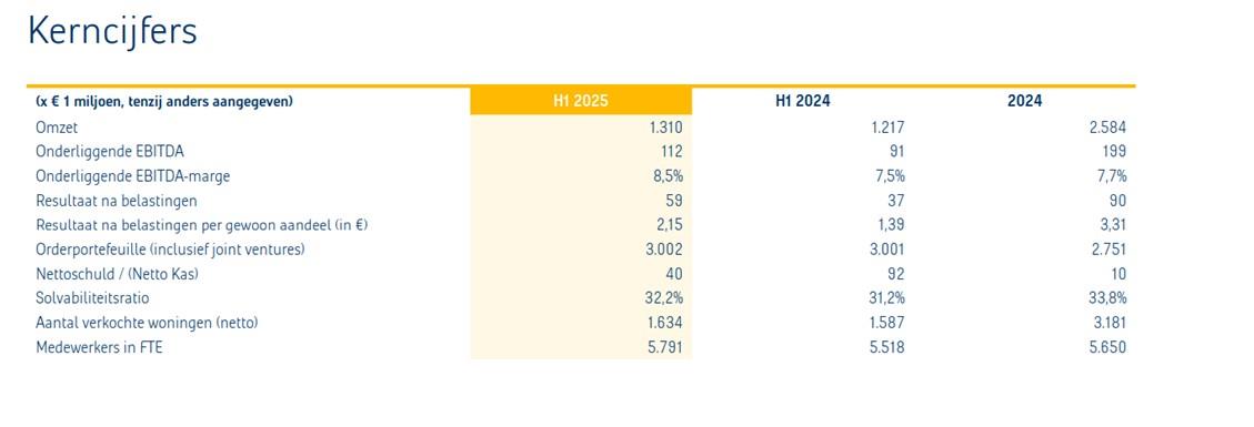 Ondanks de grotere instabiliteit in de wereld en de politieke onzekerheid na het vallen van het kabinet Schoof, zien wij de toekomst positief tegemoet. De sterke prestaties in het eerste halfjaar van 2025 leggen een basis voor de resultaten voor het gehele jaar. Alle segmenten hebben de verbetering van de onderliggende EBITDA-marge voortgezet, ook dankzij de kwaliteit van het orderboek, die zich steeds verder positief blijft ontwikkelen. Dat geeft ons voldoende vertrouwen om de outlook voor de onderliggende EBITDA-marge voor het gehele jaar te verhogen naar circa 9,0%. Heijmans handhaaft de omzet outlook voor 2025 van rond € 2,75 miljard. De voortgang op de strategie 'Samen naar 2030' verloopt voorspoedig en binnen de strategische pijlers Welzijn, Duurzaamheid, Verbinding, Maakbaarheid en Team worden concrete stappen gezet. Tegelijkertijd blijft Heijmans investeren in een robuuste organisatie, die voorspelbaar is en waarmee we de voorwaarden creëren voor toekomstige groei. Download hieronder het volledige persbericht van de Halfjaarcijfers 2025.