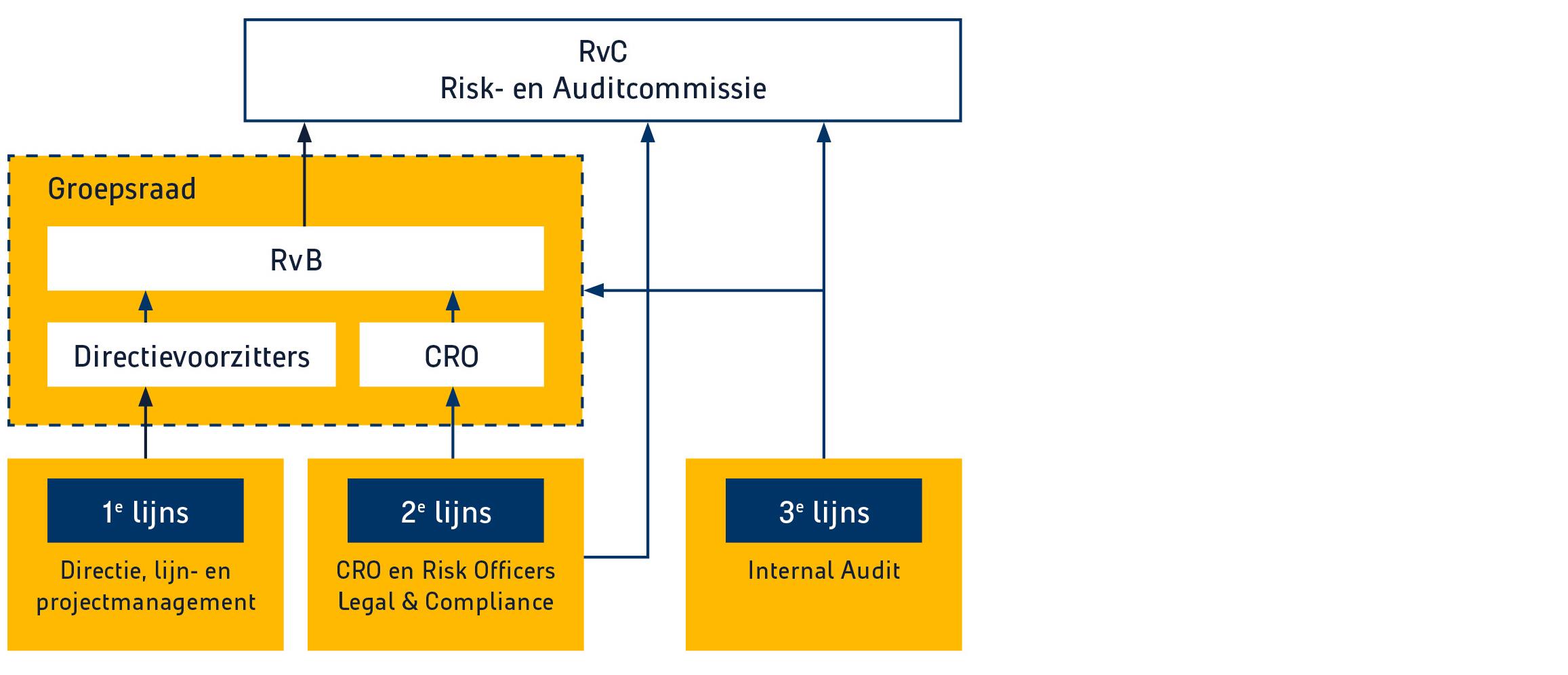 Per kwartaal wordt door Risk Office en Internal Audit een rapportage opgesteld die wordt besproken met de raad van bestuur, de groepsraad en de risk- en auditcommissie. In deze overleggen ligt de focus op eigenaarschap en opvolging van mitigerende maatregelen en verbeteracties.