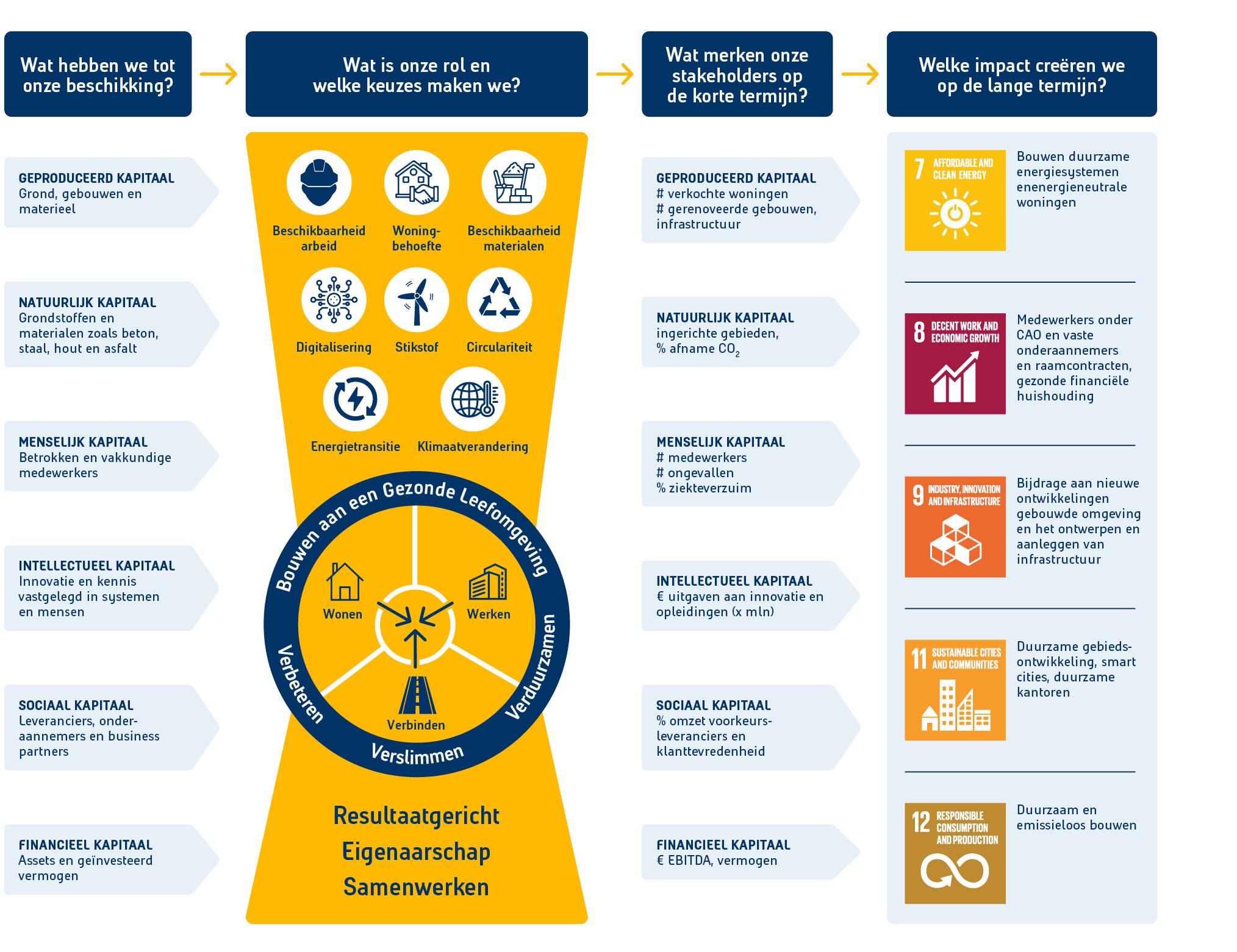 In de afgelopen jaren hebben we prestatie-indicatoren geformuleerd voor verschillende niet-financiële ambities. Die ambities zijn te koppelen aan de SDG-doelen. Met de opgenomen prestatie-indicatoren meten we de stand van zaken in relatie tot de waardecreatie, maar ook de impact op de samenleving. Onze belangrijkste positieve impact bestaat uit het creëren van gebouwen om in te wonen en in te werken, het faciliteren van mobiliteit en het realiseren van voorzieningen om klimaatverandering te mitigeren (dijken, waterbergingen). Onze belangrijkste negatieve impact bestaat uit emissies (zoals CO2 en stikstof), grondstofverbruik en afval. In het overzicht van prestatie-indicatoren, in bijlage 11.6.4, maken wij zichtbaar hoe dit zich verhoudt tot de doelen uit onze strategie, tot onze materiële thema’s en tot de SDG's die wij geselecteerd hebben. Daarmee geven we ook aan welke impact we creëren in de maatschappij, bijvoorbeeld in het kader van klimaatverandering